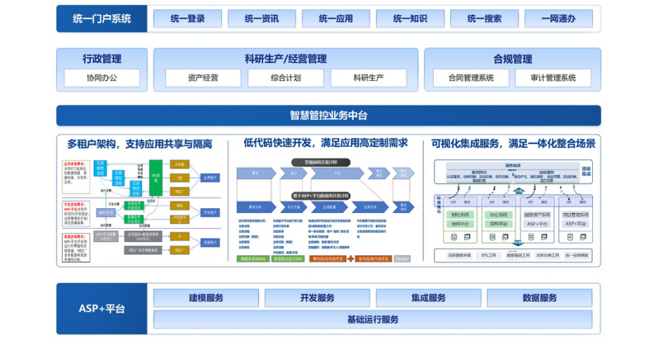 ASP+基礎(chǔ)運(yùn)行服務(wù):提供了云原生、微服務(wù)、組件化、服務(wù)化等基礎(chǔ)運(yùn)行環(huán)境和可復(fù)用的基礎(chǔ)技術(shù)組件、可共享的技術(shù)服務(wù),為用戶業(yè)務(wù)系統(tǒng)建設(shè),從平臺(tái)層面實(shí)現(xiàn)環(huán)境適配能力和全面安全保障能力。