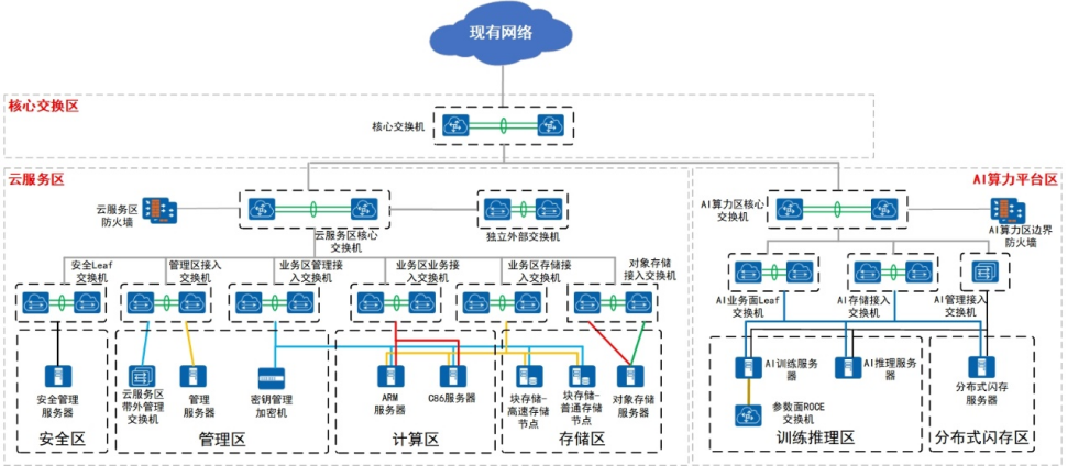 方案設(shè)計(jì):根據(jù)需求分析結(jié)果,設(shè)計(jì)定制化的云數(shù)據(jù)中心基礎(chǔ)設(shè)施建設(shè)方案。涵蓋計(jì)算基礎(chǔ)設(shè)施、存儲(chǔ)基礎(chǔ)設(shè)施、網(wǎng)絡(luò)基礎(chǔ)設(shè)施、安全基礎(chǔ)設(shè)施、電力基礎(chǔ)設(shè)施、制冷基礎(chǔ)設(shè)施、機(jī)房設(shè)施、管理與監(jiān)控系統(tǒng)等各個(gè)子系統(tǒng)的架構(gòu)設(shè)計(jì),確保各部分協(xié)同工作,滿(mǎn)足用戶(hù)長(zhǎng)期發(fā)展需求。