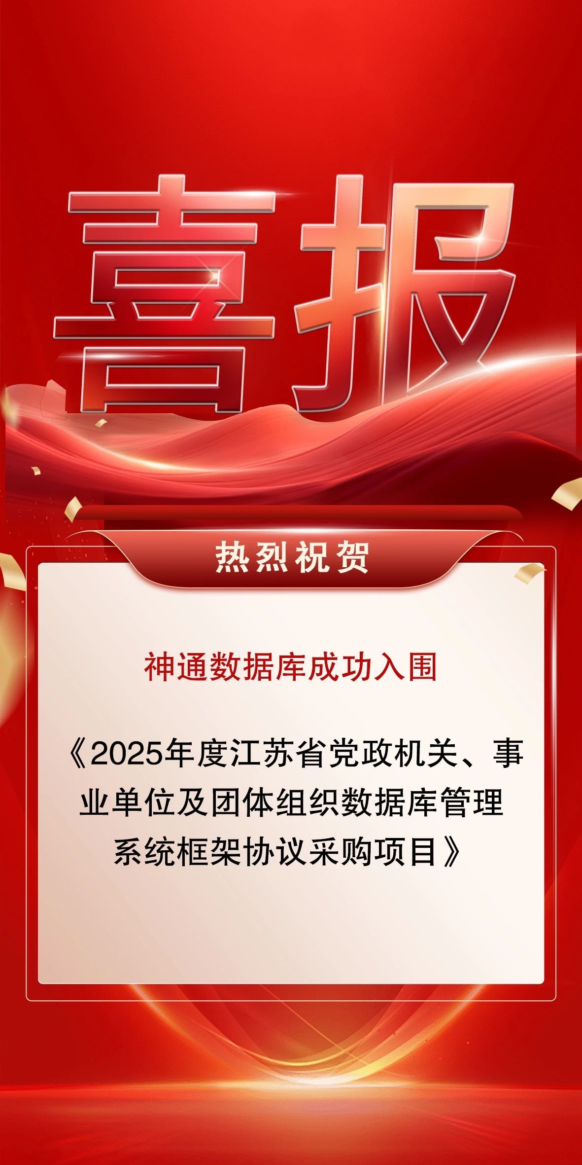 喜訊 神通數(shù)據(jù)庫入圍2025年度江蘇省黨政機(jī)關(guān)、事業(yè)單位及團(tuán)體組織數(shù)據(jù)庫管理系統(tǒng)框架協(xié)議采購項(xiàng)目